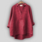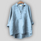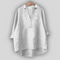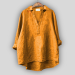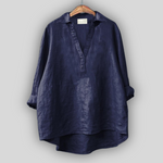 Изработена от лека ленена материя, блузата разполага с V-образно деколте и три копчета, които осигуряват стил и удобство през целия ден. Дългите ръкави с опция за навиване добавят допълнителна гъвкавост, а асиметричният завършек с по-дълъг заден край придава уникален вид.