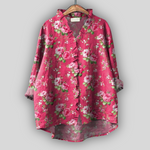 Златлиа е романтична ленена блузка в интензивен розов нюанс с цветен десен на рози, който излъчва женственост и елегантност. С V-образно деколте и дискретни волани, тя предлага комфорт и въздушно усещане.