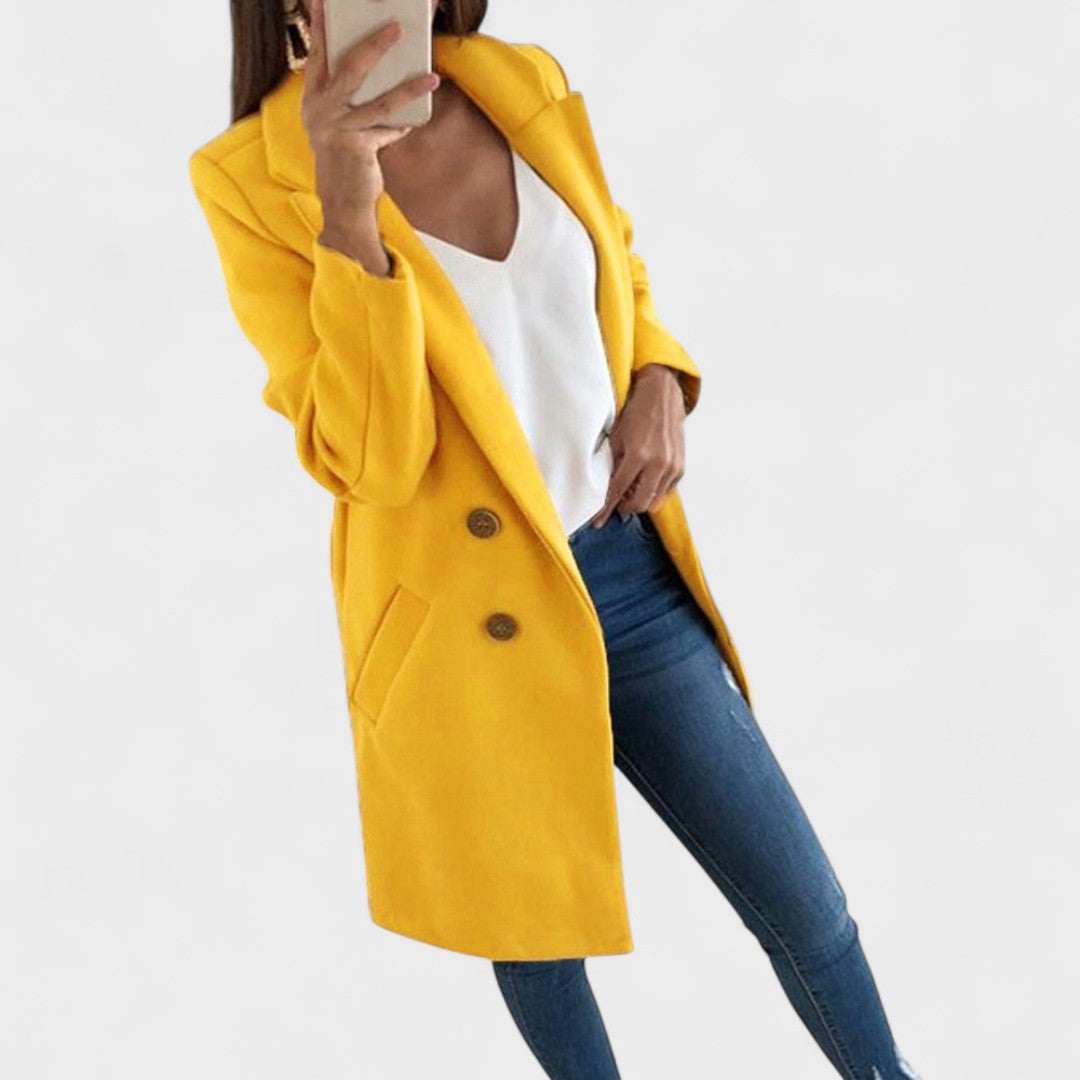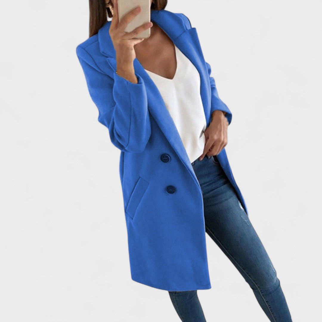 Правият крой и дължината до средата на бедрата придават изискан вид. Практичните странични джобове и закопчаването с два копчета осигуряват функционалност и лекота при носене.