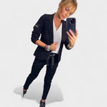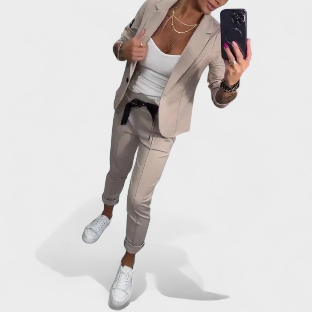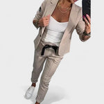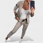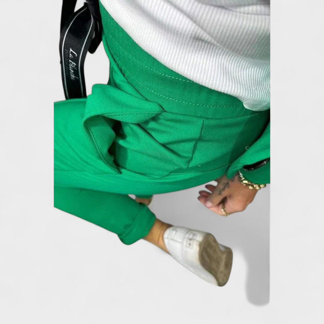 Зеленият комплект с уникални детайли предлага изключителен комфорт и стил през целия ден. Сакото и спортните панталони съчетават елегантност с неформалност, създавайки перфектен вид.