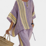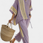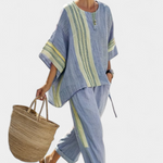Комплект от раирани панталони и тениска 'Самара' предлага релаксираща елегантност с артистичен щрих. Изработен от лек и проветрив ленен бамбук, той е идеален за топли дни и летни приключения.