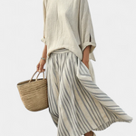 Талия - Комплект панталон и пола е идеалният избор за слънчеви дни и крайбрежни разходки. Със своята мека тениска с широки ръкави и проветрива midi пола с райета, комплектът Daisy предлага естествена и елегантна визия.