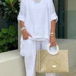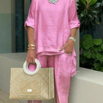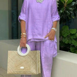 Този дамски комплект е идеален за ежедневието, изработен от олекотена памучна смес. С петминутни ръкави и кръгло деколте, той предлага комфорт и стил.