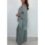 Свободният дизайн на горната част и широките панталони съчетават елегантност и удобство, перфектни за преход от дневни ангажименти към вечерен релакс.