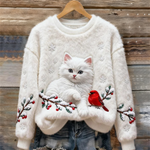 Ансия - Удобен пуловер с мотив на снежна котка в ментово зелено