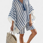Морска свежест с отпуснато очарование. Комплект Нанси се отличава с oversized риза с райе в тъмносиньо и бяло, в комбинация с елегантни шорти за летен и безгрижен вид. Детайли като деколте с декоративни ресни и текстилен завършек добавят характер и лекота.